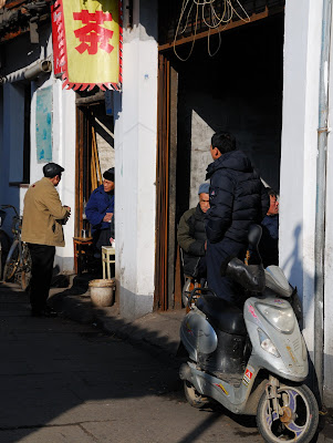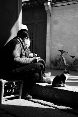 绍兴冬日阴冷潮湿。每当晴天,老街的人们喜欢坐在自家台门口晒太阳,或是逛逛茶社。