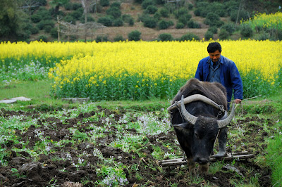 晓起,细雨朦胧,田园、耕牛、农舍如牧歌般宁静。