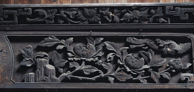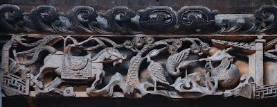 理坑,司马第木雕 - 鹿鹤同春。松、鹿、鹤,意为长寿,特用来祝福长辈。